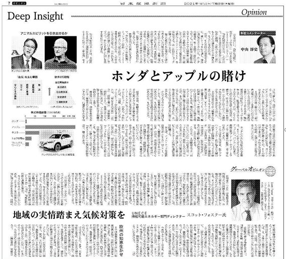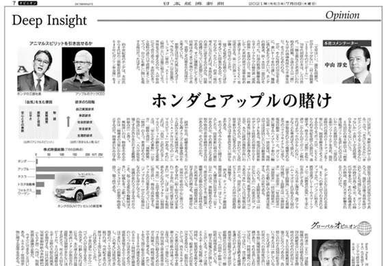 本日7月8日の『日本経済新聞』、“Deep Insight”記事(日経新聞・中山淳史コメンテーター記事「ホンダとAppleの賭け」)において、私のコメントが掲載されました。