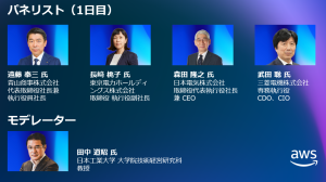 AWSが取引先の著名経営者に直接声をかけ、準備された展開ではなく、それぞれの経営者が本気でテーマに対峙して討論して欲しいとの企画趣旨から、モデレーターとしてご指名いただきました。打ち合わせ不能・不要の本番セッションでした。